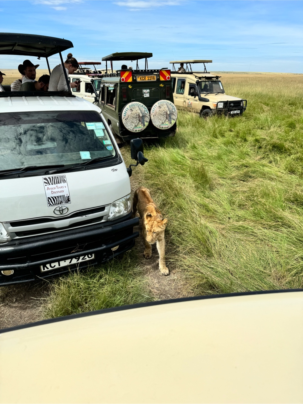 By sunset, we’d already seen four of the Big Five - lions, elephants, rhinos, and buffalo, with only the leopard missing. Hyenas, ostriches, and gazelles filled the gaps, and we learned that “Mara” means “dotted” - referring to the spotted animals and the scattered acacia trees. Lions, we discovered, also enjoy shade from tourist jeeps.